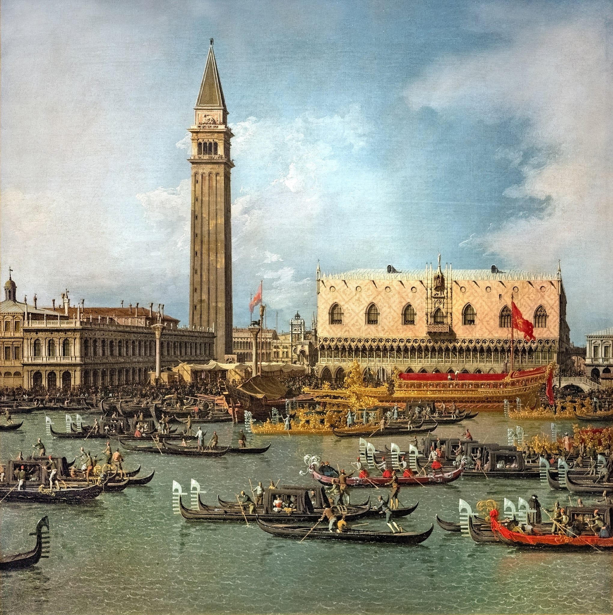 Next, we cross the Accademia Bridge and enter the Gallerie dell’Accademia, Venice’s foremost art museum, housed in a former monastery. Here, Venetian painting unfolds from the Byzantine Middle Ages to the Rococo. We admire Giorgione’s enigmatic Tempest, Veronese’s grand Feast in the House of Levi, Tintoretto’s dramatic Miracle of the Slave, and Bellini’s luminous altarpieces. The gallery’s collection captures the soul of Venice, with Canaletto and Guardi offering atmospheric views of the city’s canals and daily life. Leonardo da Vinci’s Vitruvian Man, when displayed, highlights the fusion of art, science, and philosophy.